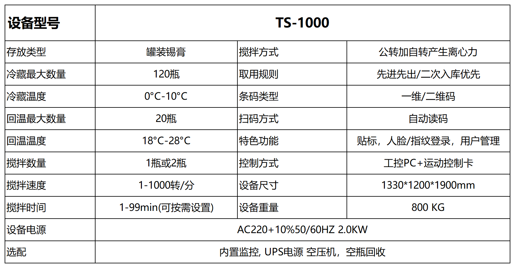 锡膏智能管理柜是一款全自动的锡膏存储设备,采用一体化设计,拥有多种功能:自动冷藏、自动回温、自动搅拌,可预约、联网,产品可追溯;设备优势:先进先出,温度均匀,个性化MES;有效保护锡膏的质量和稳定性,减少浪费和损失,为电子制造企业提供了更加便捷和高效的锡膏管理解决方案。